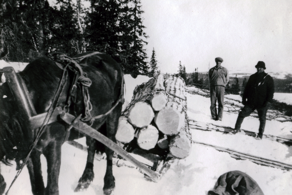 Når jeg er kommet inn på skogsdriften, vil jeg få lov til å omtale den litt nærmere. Slik som den drives her, er den nok forskjellig fra den dere kjenner fra de veldige amerikanske skoger. Jeg har hørt mye tale om driften i Minnesotas skoger i gamle dager og om livet i ”campen”. Ja, det er ikke fritt for at jeg har lest litt om hvorledes det drives på Vestkysten og i Canada i våre dager. Alt der borte er jo etter kjempemessig målestokk, enten det er trær, lass eller trekk-kraft. Nei, her er det omtrent på samme måte som det har vært i generasjoner. Redskapene – øks, sag, slede (doning) – er kanskje bedre, men trærne felles med håndmakt, barkes og slepes til rette for å kjøres. Så kommer kjøreren, svinger bort til hver stokk og kjører dem sammen i lunner. Senere kjøres så lunnene til elvemælen. Er veien fin og ellers passe, så kan nok lassene bli adskillig dryge. Når lendet passer, kan det bli lenkekjørt, den ene stokken lenkes til den andre i en lang rekke, og når man en gang har fått det av sted, danser de nok så villig etter hverandre.